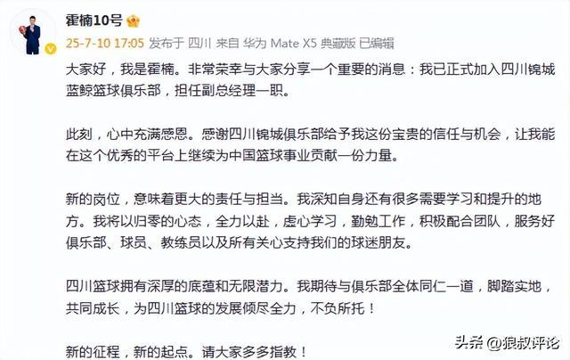 四川男篮副总经理霍楠更新社媒,不仅打破自己已经离开四川男篮俱乐部的传闻,也对网络上涉及四川男篮深陷欠薪等事宜做出点评。