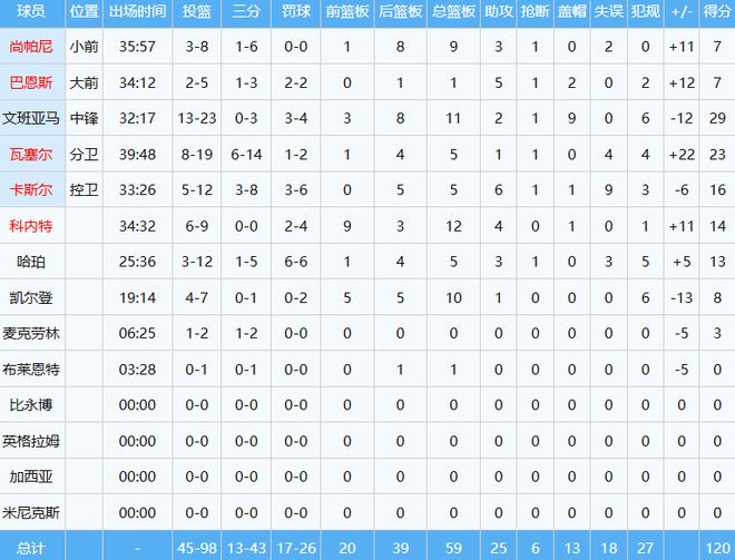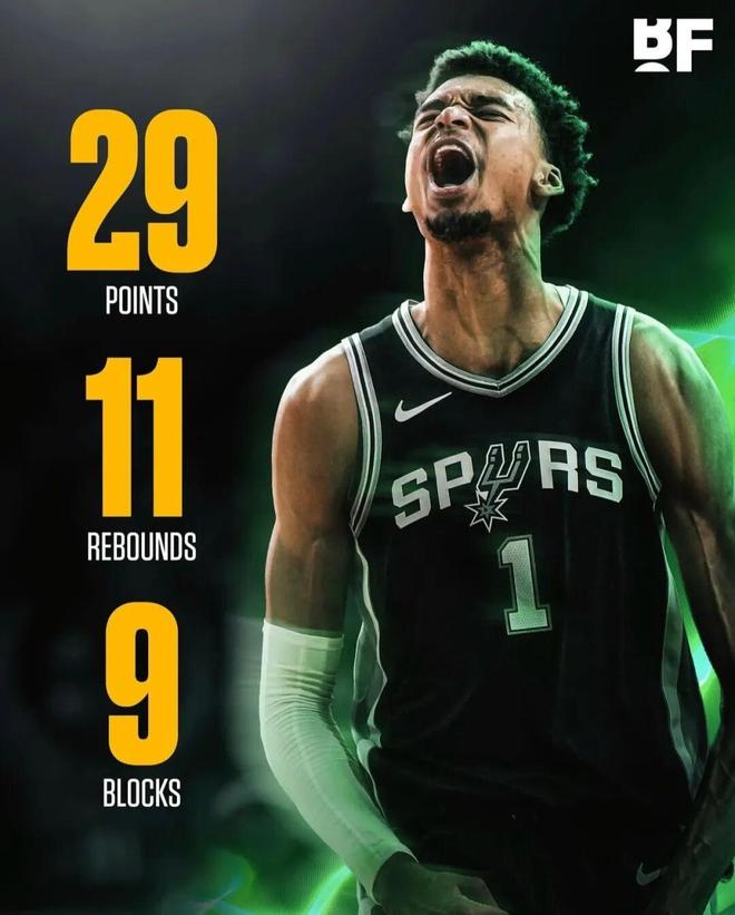 文班亚马29分11板9帽超级准时三双进账,我家胖虎27分10板7助3断全面数据到手。