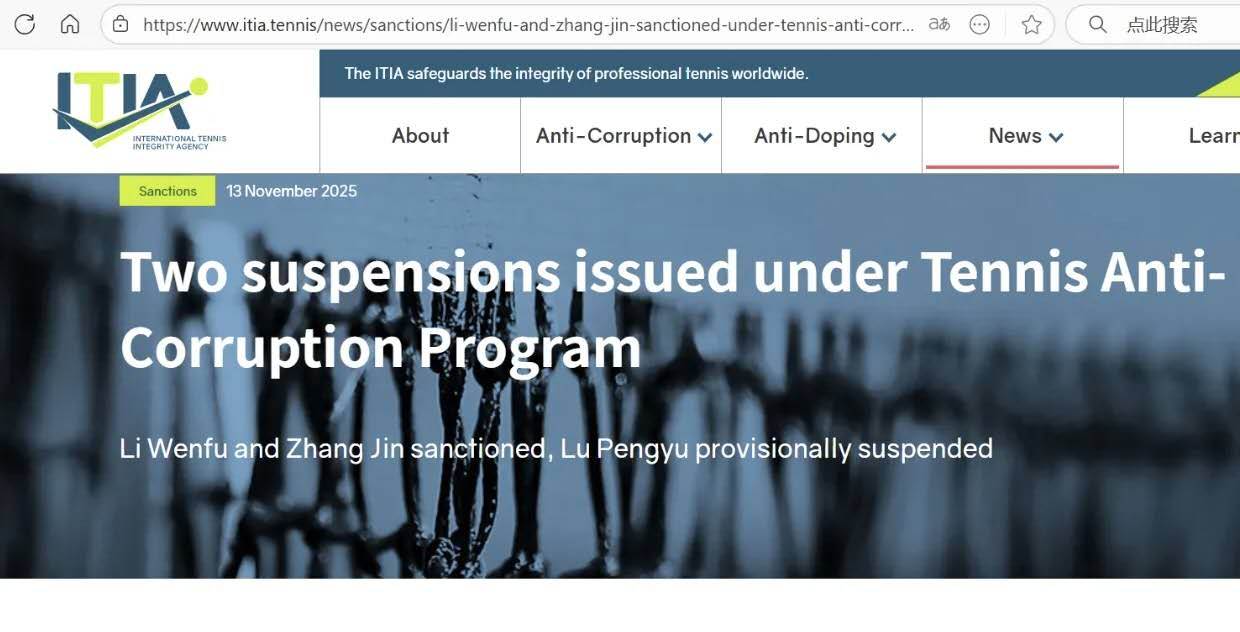 中国网球假球丑闻!三名中国球员因涉嫌操纵比赛遭ITIA禁赛罚款!