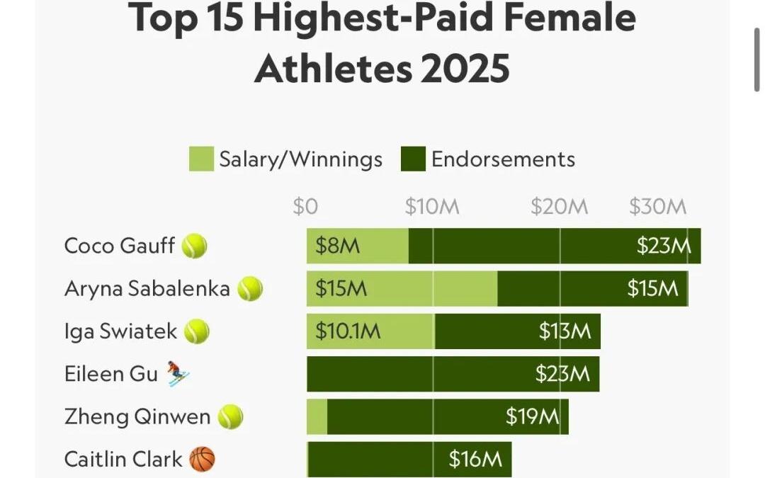 中国独占两席!2025年女运动员收入TOP10出炉:谷爱凌郑钦文列前5