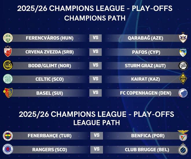 雷速体育8月13日讯 今日凌晨,2025/26赛季欧冠资格赛第三圈的次回合比赛全部结束,欧冠附加赛对阵结果出炉。