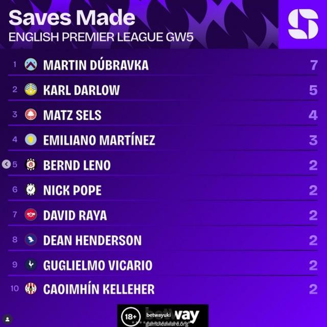 9月24日讯 英超第5轮战罢,squawkafootball列各项数据排行,伯恩利门将杜布拉夫卡是本轮扑救次数最多的门将,共有7次。