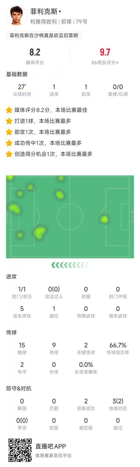 加盟沙特利雅得胜利之后,25岁的菲利克斯至今各项赛事为球队出战7场,斩获7球2助,多次当选MVP。本场比赛菲利克斯的进球来自自己策动,然后突破,最后接队友传球完成终结,堪称“降维打击”。赛后的评分,出战不到半小时的菲利克斯全场最高。
