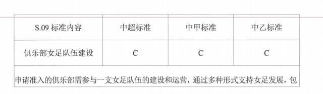另外,涉及到俱乐部女足队伍建设,中超标准为“A”、中甲和中乙标准为“C”。